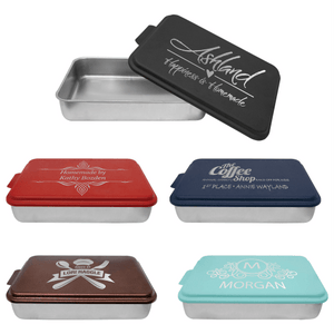 Our personalized aluminum cake pan and lid are perfect for potlucks and bake sales which allows you to personalize it with your message or name. This 9x13 cake pan with personalized lid is heavy gauge, American made aluminum. The pan has a large, rolled edge that acts as a convenient handle for removal from the oven. The aluminum cake pan lid has its opening tab on the long side of the pan.
